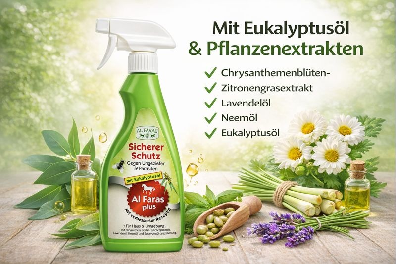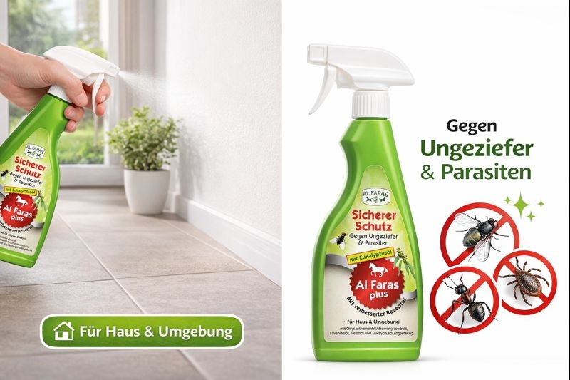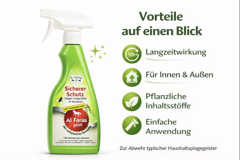 Der AL FARAS Insektenschutz bietet zuverlässige Hilfe gegen störendes oder schädliches Ungeziefer in Haus, Garten und auf Oberflächen. Dank natürlicher Wirkstoffe wie Eukalyptusöl und Chrysanthemum-Extrakt schützt er effektiv vor: