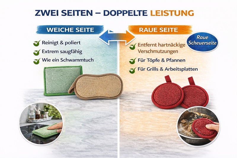 ✔ Raue Seite gegen hartnäckige Verschmutzungen