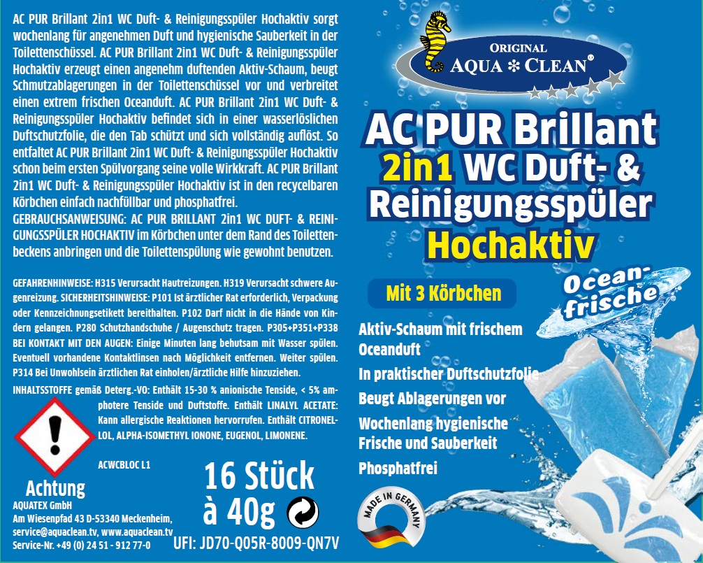 16x AC-Pur Brillant 2in1 WC Duft- & Reinigungsspüler Hochaktiv, 15 Stück Ocean à 40 g