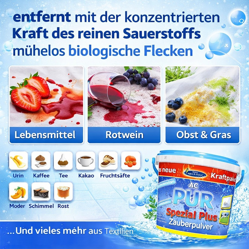 AC-PUR Spezial Plus Zauberpulver ist ein hochwirksames, chlorfreies Sauerstoff-Bleich- und Reinigungsmittel zur Entfernung hartnäckiger biologischer Verschmutzungen. Mit der konzentrierten Kraft des reinen Sauerstoffs beseitigt es mühelos Flecken und Gerüche aus Textilien sowie Verschmutzungen auf glatten und porösen Oberflächen – schonend, vielseitig und effektiv.